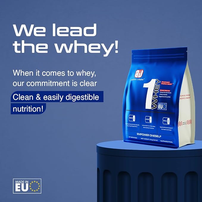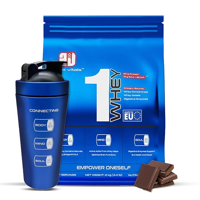 Apex Vitals 1 Whey Protein + Free Shaker | Made in Europe | Grass-fed Whey | FSSAI, EFSA & FDI Certified | 23g Protein, 13g EAA + BCAA | Concentrate 60%, Isolate 40%, Digestive Enzymes | 2Kg – 67 Ser – Belgian Chocolate