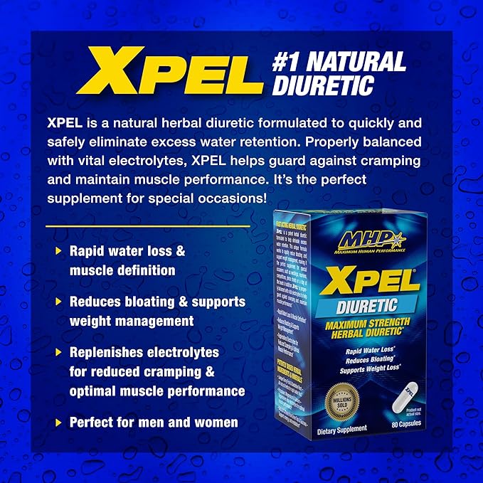 WHAT IS XPEL? For over a decade, millions of Americans have chosen Xpel to help them shed unwanted water weight fast. Our commitment is to quality products driven by science. WHAT DOES XPEL DO? Xpel is an potent herbal diuretic that is scientifically formulated to eliminate excess water retention. This unique formula works to rapidly reduce bloating and support fat loss, making it the perfect supplement for special occasions, such as weddings, reunions, competitions, photo shoots or a day at the beach. In addition, Xpel is properly balanced with vital electrolytes to help guard against cramping and maintain muscle performance.WHAT MAKES XPEL BETTER THAN OTHER DIURETICS?Xpel is uniquely driven by MHP science, and provides a natural solution to water loss, to help you look your best quickly. Xpel has an incredibly legacy of success, having been trusted by satisfied customers for over a decade.